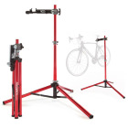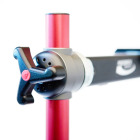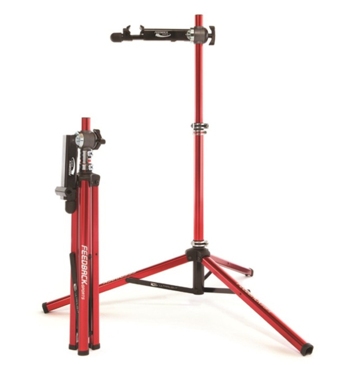 Стойка для ремонта Pro Ultralight, является профессиональной облегченной стойкой, для ремонта и обслуживания велосипедов от компании Feedback. Стойка выполнена из очень легких и прочных материалов - анодированные алюминиевые 6061 T6 трубы и направляющие, резиновые упоры и пятки, зажим барашком. Конструкция полностью складная и в сложенном состоянии она занимает в высоту 97 сантиметров что очень удобно на выездных соревнованиях. В разложенном состоянии регулируется от 90 до 145 см, за счет чего можно без проблем подстроить ее под велосипед и рост мастера. Все подвижные узлы стойки имеют прочную фиксацию. Зажим имеет регулировку под диаметр, форму труб и горизонтальное положение, которая позволяет четко разместить и зафиксировать велосипед. Также зажим имеет возможность вращения на 360 градусов, за счет чего его удобно настроить под использование правой или левой рукой. Зажим оснащен резиновым упором, за счет которого нет риска повреждения ЛКП труб, передавливания тросов и рубашек. Зафиксировать возможно практически любой велосипед с диаметром трубы рамы до 4,8 см, общая грузоподъёмность составляет 39 кг. Велосипед можно зафиксировать как за верхнюю трубу рамы, так и за подседельный штырь. Для установки велосипеда на стойку необходимо ослабить барашек положения фиксатора, установить велосипед на зажим и затянуть его, от центровать положение велосипеда, после чего затянуть фиксатор.